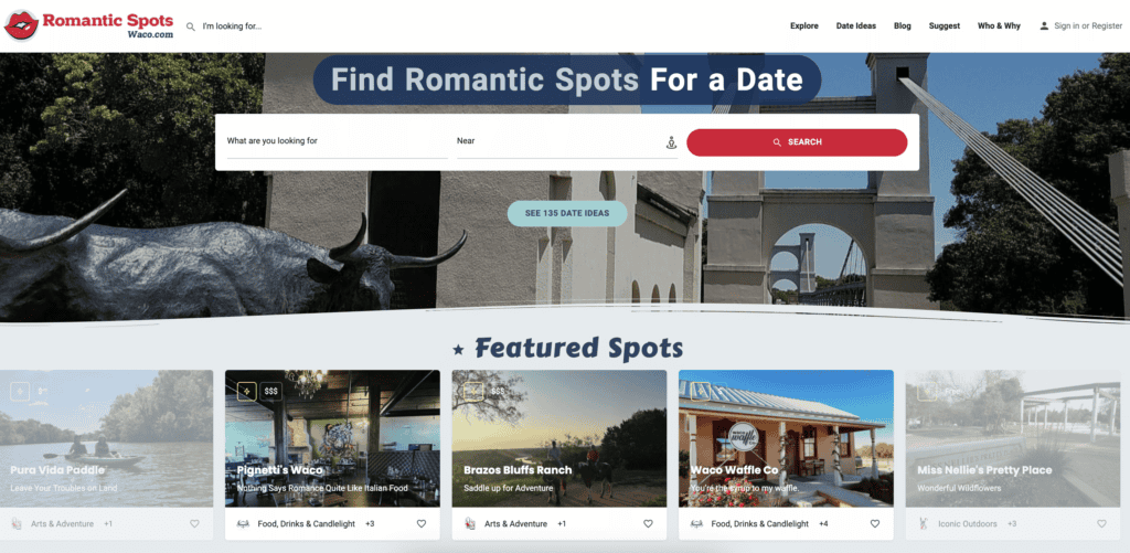 Take a moment to create an account so you can bookmark the spots you are interested in and leave reviews for the spots you’ve visited. Then take a second moment to let your friends know they need to check out Romantic Spots Waco too!